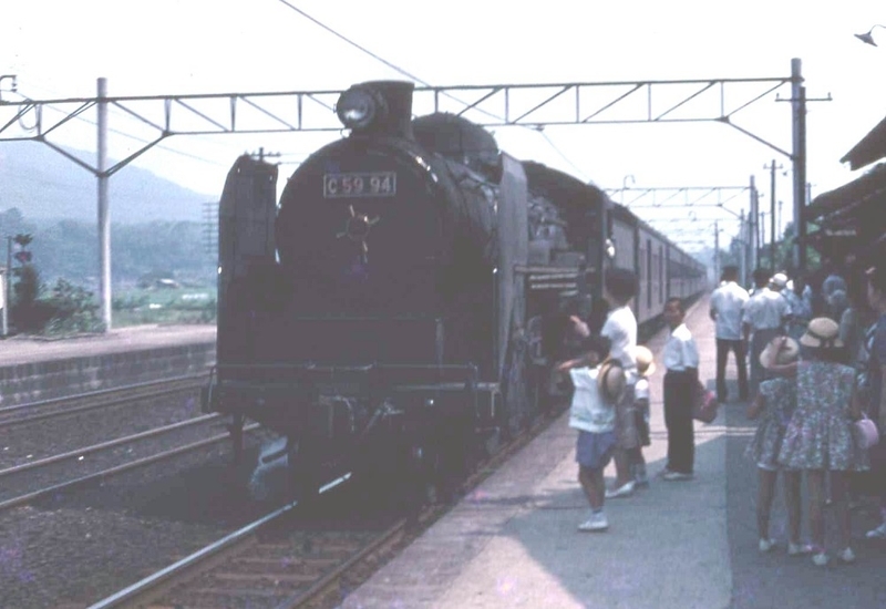 このくらいである。昨年挙げた58に比べると少ない。どの形式も限定した地域でのみ活躍してすでに引退したものばかり(国鉄自体がもう存在しないのだから当たり前)。クロハ59に至っては戦前の車両だしもちろん小生は実物を知らない。EF59もキハ59も見たことがない。ただC59は我が家の古いアルバムを開くと小生6歳の時家族で山口県を旅行した際遭遇している。電化工事が進む山陽本線で島田から小郡(現・新山口)まで乗った普通列車をけん引してやってきた。私自身はそれを覚えていないけれど写真は残っている。1963年7月21日 山陽本線島田にて