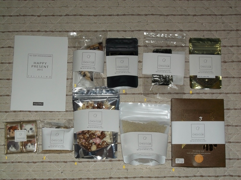 フェリシモといえば衣料品の通販で知られているが食品も取り扱っている。100株以上保有の株主対象に年1回3000円相当の自社製品詰め合わせが送られる。今年はHAPPY PRESENT2015と称して自社取り扱いの食品9品目が送られてきた。